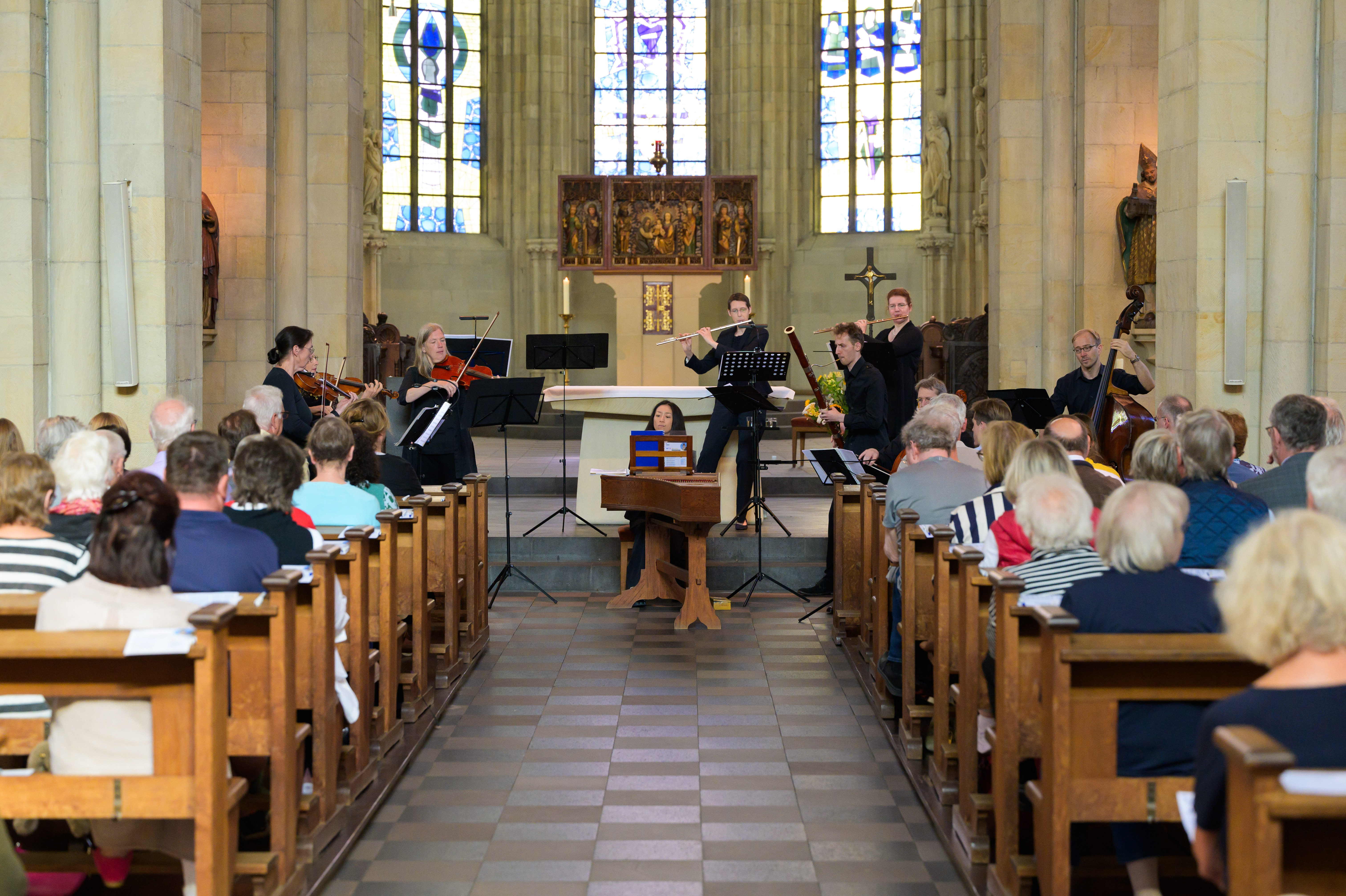 Musikerinnen und Musiker rund um Flötistin Annette Weßler-Enselein begeisterten beim Barock-Konzert in der St. Ludgeri-Kirche. Eingeladen hatten das WTZ Münster und die Stiftung Universitätsmedizin Münster. Mit den gesammelten Spendengeldern in Höhe von rund 3.500 Euro werden therapiebegleitende Angebote finanziert. | lie