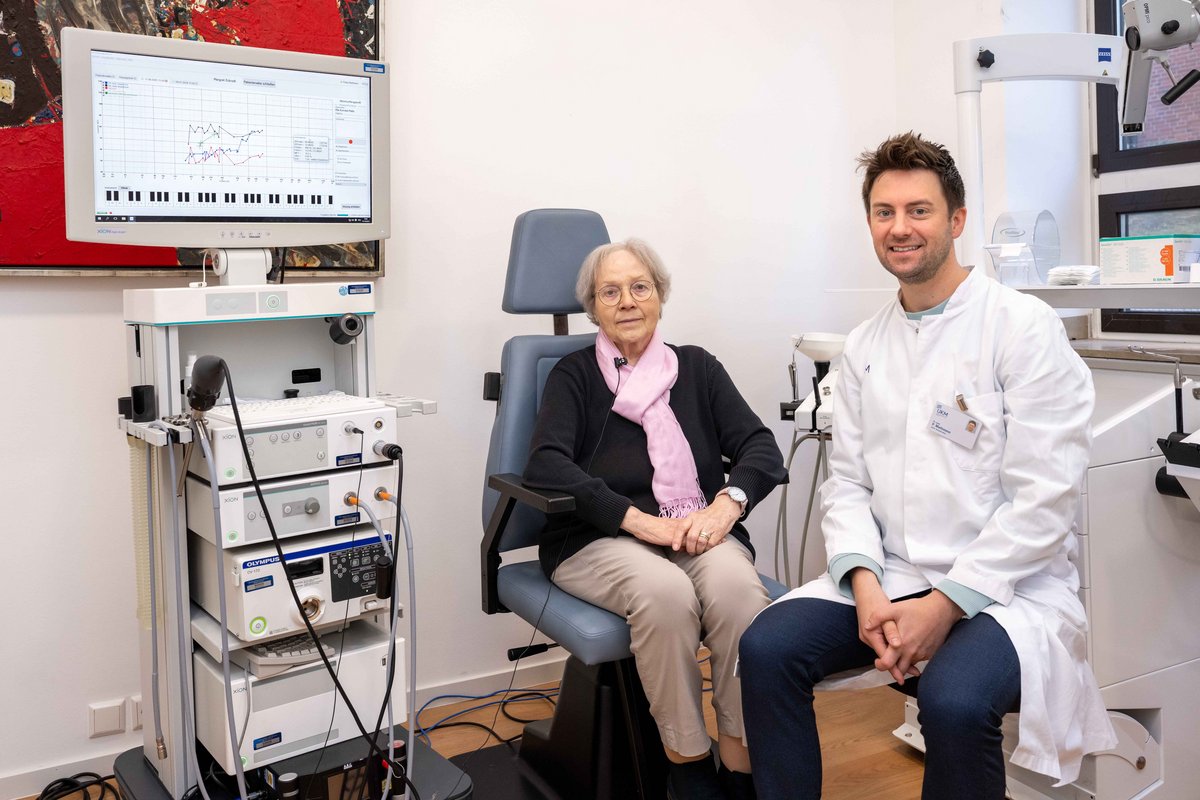 Dass Margret Eckrodt (82) überhaupt Patientin der Klinik für Phoniatrie und Pädaudiologie am UKM (Universitätsklinikum Münster) wurde, ist die Folge einer Bronchoskopie im Sommer 2023. Diese reizte nachhaltig den Rekurrenznerv, der die Stimmbildung maßgeblich steuert. Die Folge: eine einseitige Stimmlippenlähmung (Parese), d.h. der Schluss der beiden Stimmlippen war nicht mehr möglich. „Nach der Operation krächzte ich regelrecht und das Sprechen war extrem anstrengend. Ich habe meine eigene Stimme nicht mehr wiedererkannt“, so die Ochtruperin. Als die extreme Heiserkeit nicht nachließ, wurde Eckrodt von ihrem behandelnden HNO-Arzt direkt in die Klinik für Phoniatrie und Pädaudiologie überwiesen, wo Dr. Philipp Mathmann als stellvertretender Klinikdirektor die phonochirurgische Sprechstunde der Klinik leitet. „Die Menschen kommen mit Stimmproblemen ganz unterschiedlicher Ursache zu uns“, erklärt er.