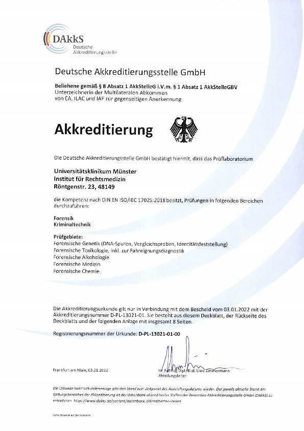 Das Institut für Rechtsmedizin am Universitätsklinikum Münster umfasst drei große Bereiche: die Forensische Medizin mit Leichenschauen, Obduktionen, Tatortbesichtigungen, Todeszeitbestimmungen, feingeweblichen Untersuchungen usw., des Weiteren die Forensische Molekularbiologie, die Abstammungsuntersuchungen und insbesondere Vaterschaftstests vornimmt, sowie die Forensische Toxikologie, die Drogen- und Alkoholabstinenz-Nachweise im Rahmen von medizinisch-psychologischen Untersuchungen durchführt.