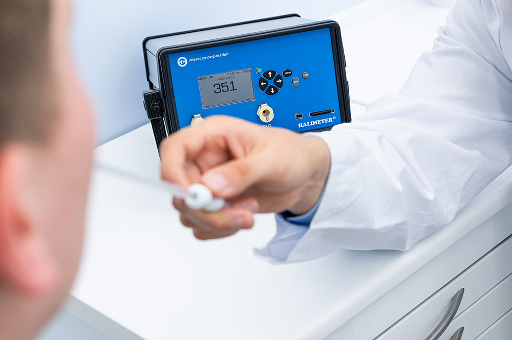 - Mit einem speziellen Gerät, dem Halimeter, können wir die Schwefelverbindung in der Atemluft direkt und objektiv messen. Dadurch wird Mundgeruch messbar. Für die Patient*innen wird so ersichtlich, wie viele flüchtige Schwefelverbindungen ihr Atem enthält.