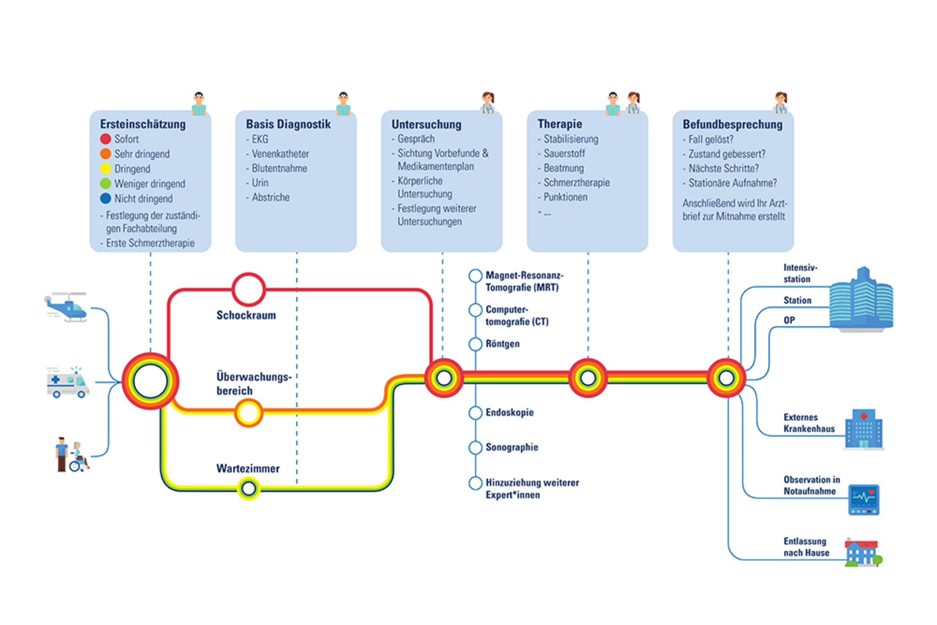 Die Abläufe in der Notaufnahme sind komplex und für medizinische Laien meist nicht unmittelbar nachvollziehbar. Dennoch gibt es einige grundlegende Behandlungsschritte, die bei allen Patient*innen ähnlich sind. Diese sogenannten „Touchpoints“ stellen wir Ihnen hier näher vor.