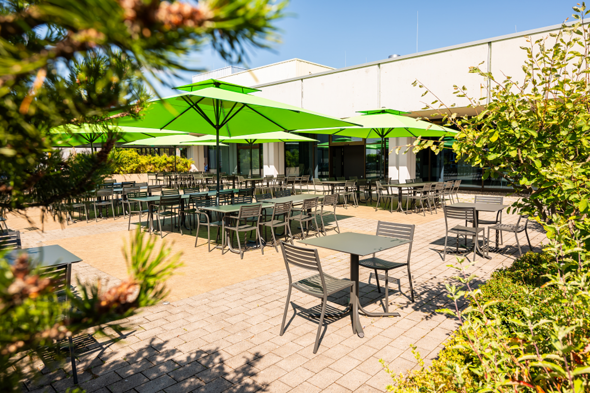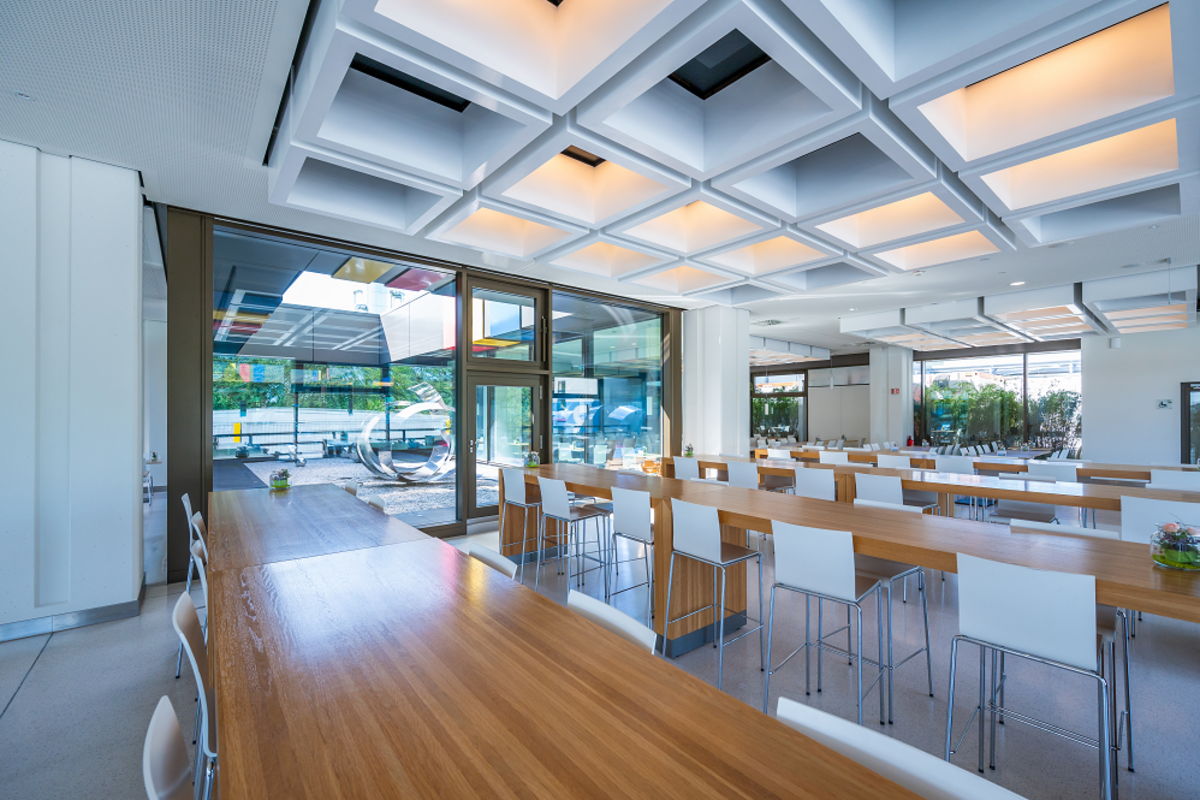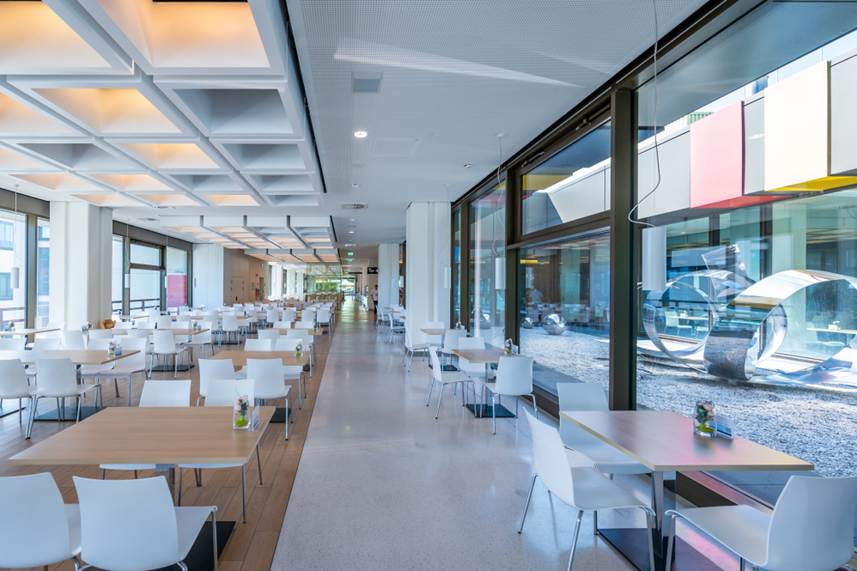 Die Cafeteria befindet sich im Versorgungszentrum im Schatten des Westturms. Der Eingang ist im Gebäudeteil D. Hier steht ein Aufzug zur Verfügung.