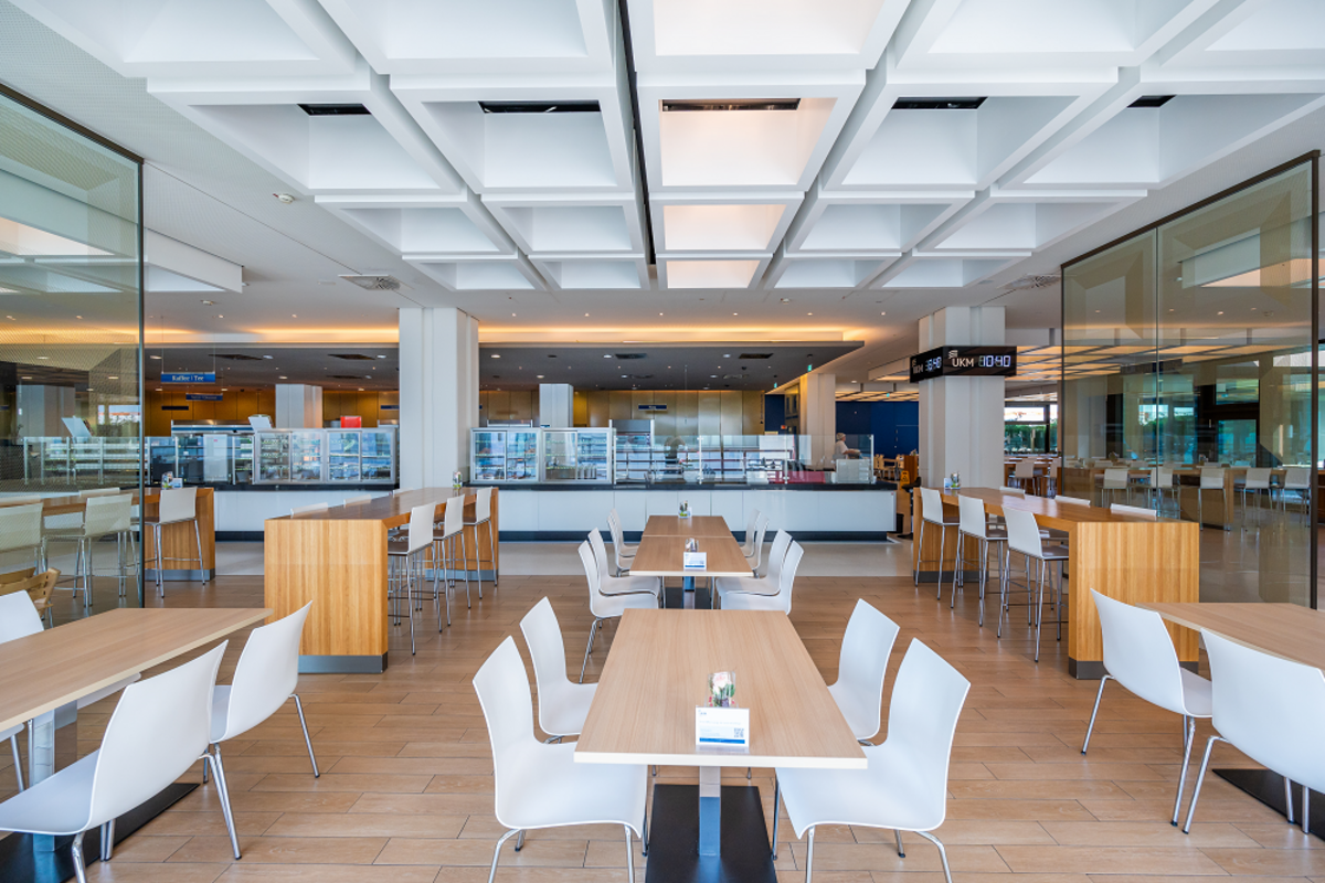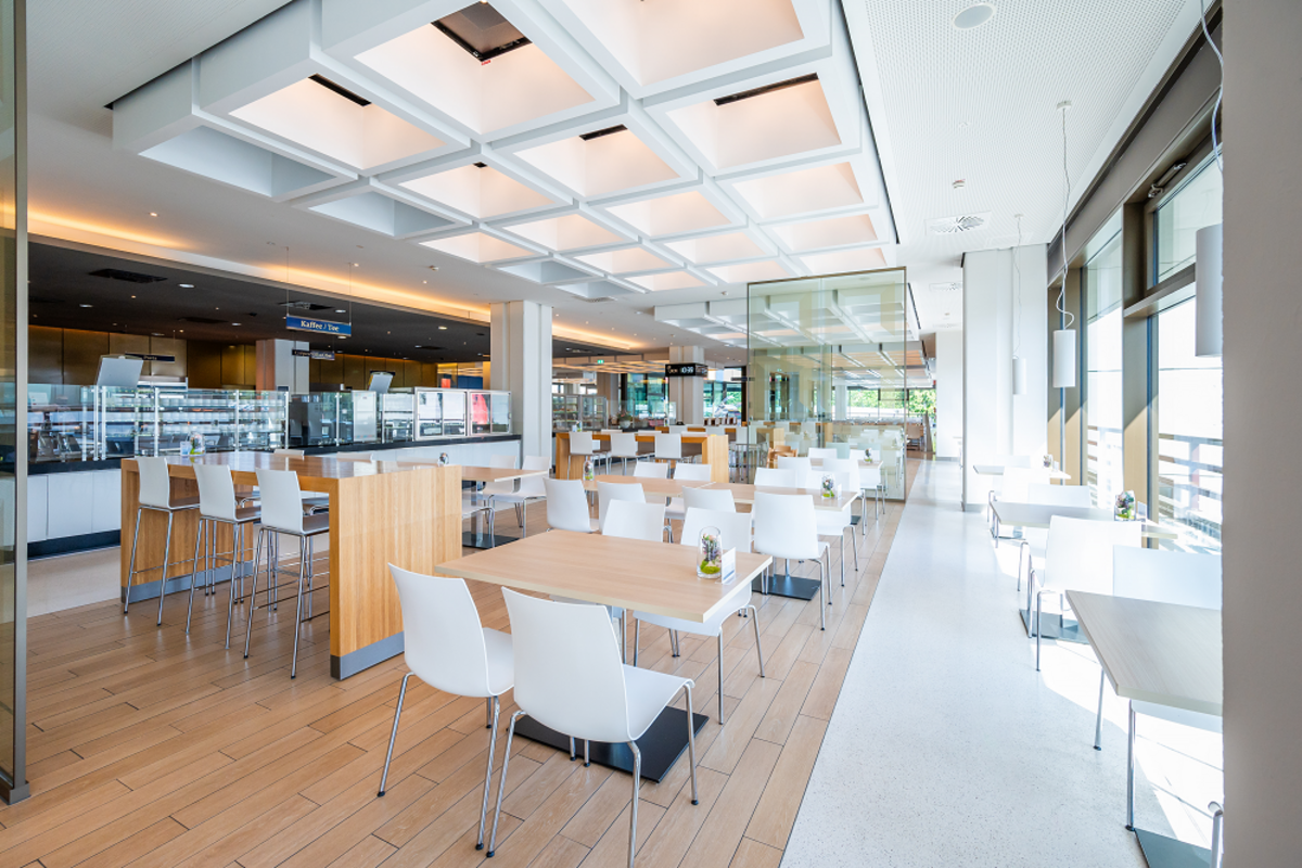Von unserem Interdisziplinären Erweiterungsbau (Zugang über den Westturm) führt ein Verbindungsgang direkt zur Cafeteria. Sie erreichen ihn über die Rolltreppen auf Ebene 04.
