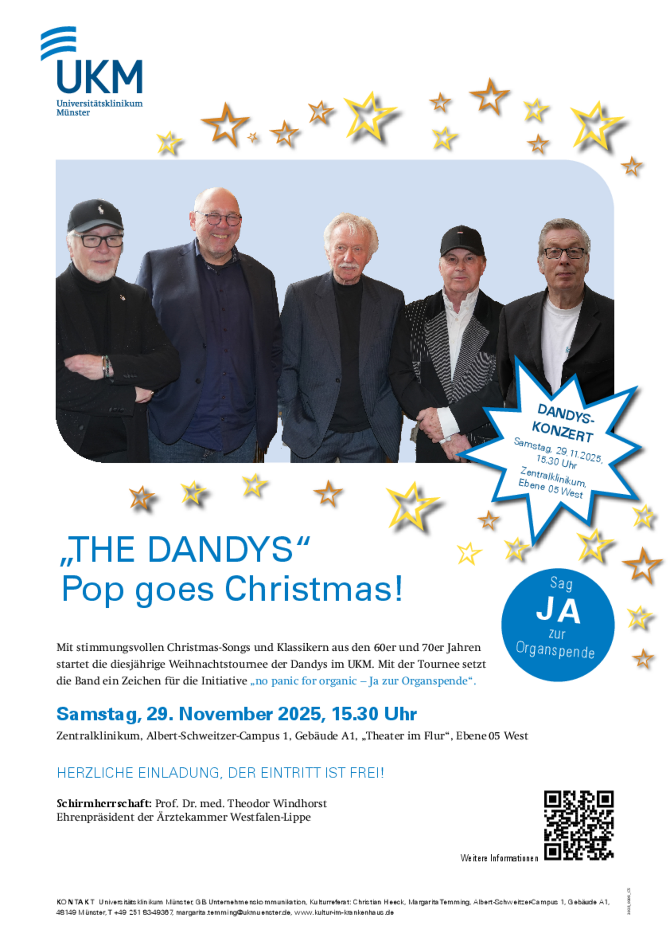 Mit Klassikern aus den 60er und 70er Jahren und stimmungsvollen Christmas-Songs startet die diesjährige Weihnachtstournee der Dandys im UKM. Mit der Tournee setzt die Band ein Zeichen für die Initiative “no panic for organic - Ja zur Organspende”. Der Eintritt ist frei!